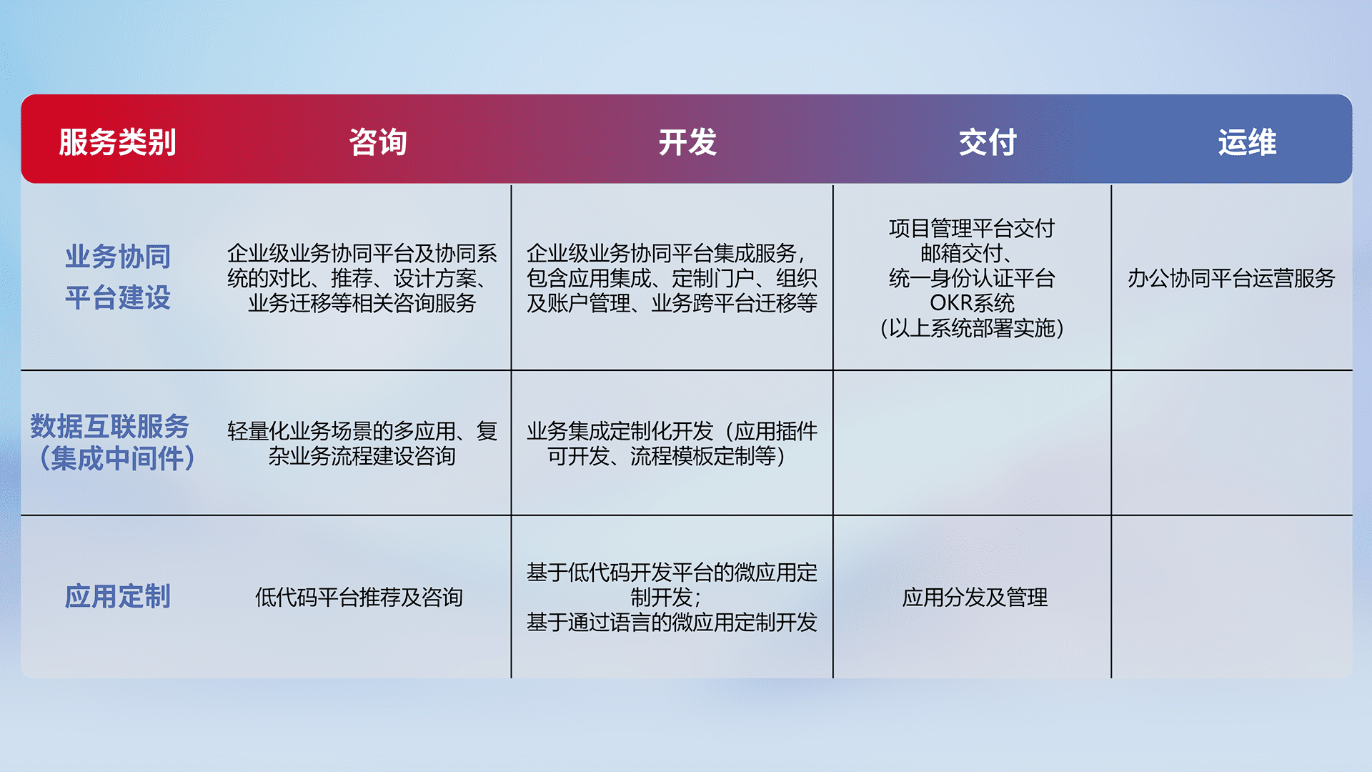 针对钉钉、、企微、、、IDaas等平台级产品提供产品的规划、、、方案、、交付、、定制化开发等服务,,,,实现如统一协同办公、、、智能客户服务、、、混合会议管理、、、智能数据查询、、等业务场景,,实现数字化转型。。