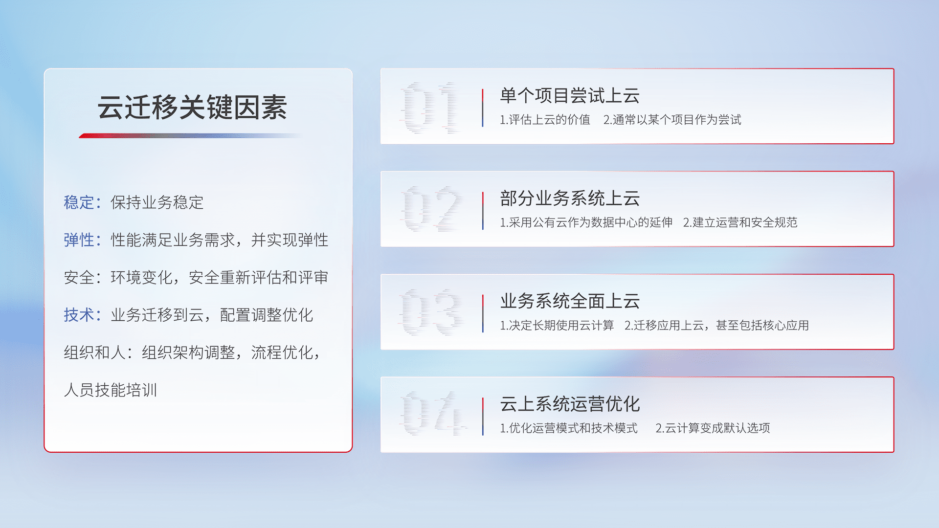 结合实际业务,,从规划设计、、、云平台选型、、、、云原生改造、、、、数据迁移、、集成交付,,,迁移全过程为客户识别最佳上云路径,,,做好风险识别管理,,设计网络架构、、身份权限、、、安全审计合规、、、操作审计、、、、日志审计、、监控告警策略、、、多站点容灾设计等,,对云上基础设施进行整体规划,,,提升IT治理水平,,,以满足弹性、、、、高可用、、高性能的需求。。。