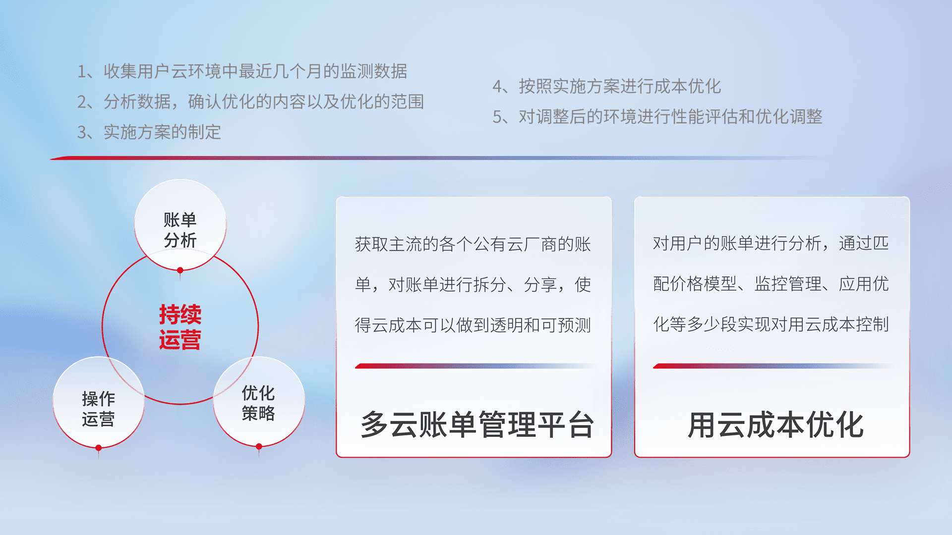 通过多云纳管,,,以统一的资源数据模型把客户的云资源进行抽象和封装,,,进而实现对多云资源的统一操作,,,保障云资源管理的可靠性、、、稳定性与可用性。。量身定制化运维内容,,配置、、开发运维、、、补丁管理、、、、备份、、、、监控、、、认证和访问管理、、审计和日常巡检等,,,,保障在用云过程中的可靠度,,,,稳定度以及高可用率。。
